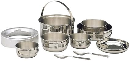 - Utilitarian cookset made of lightweight stainless steel for two campers